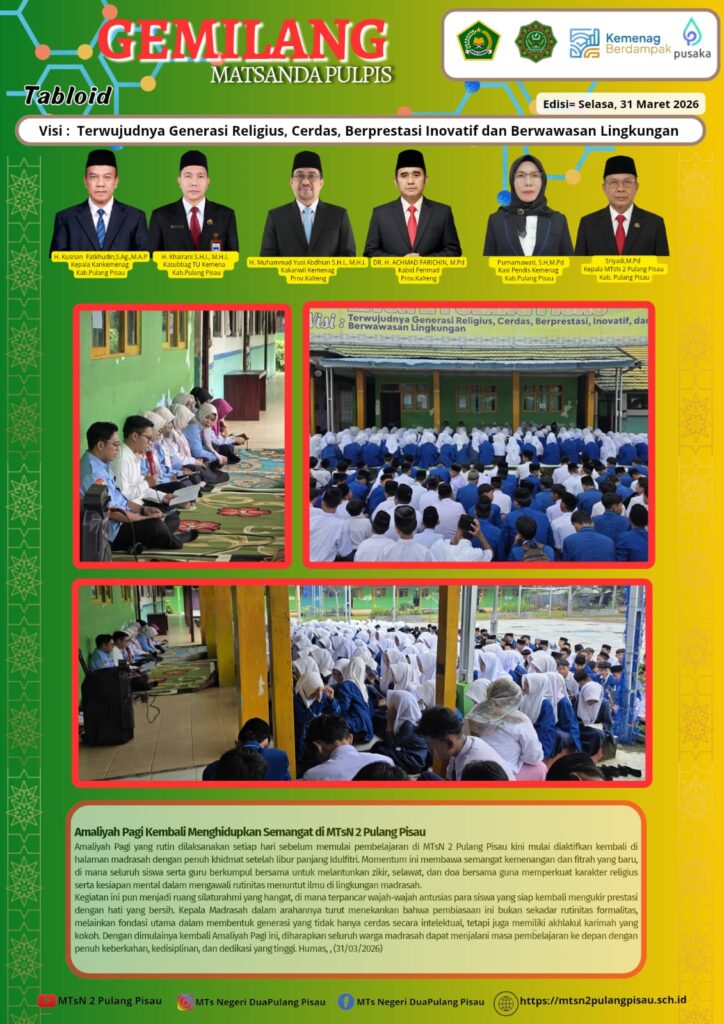 Amaliyah Pagi yang rutin dilaksanakan setiap hari sebelum memulai pembelajaran di MTsN 2 Pulang Pisau kini mulai diaktifkan kembali di halaman madrasah dengan penuh khidmat setelah libur panjang Idulfitri. Momentum ini membawa semangat kemenangan dan fitrah yang baru, di mana seluruh siswa serta guru berkumpul bersama untuk melantunkan zikir, selawat, dan doa bersama guna memperkuat karakter religius serta kesiapan mental dalam mengawali rutinitas menuntut ilmu di lingkungan madrasah.