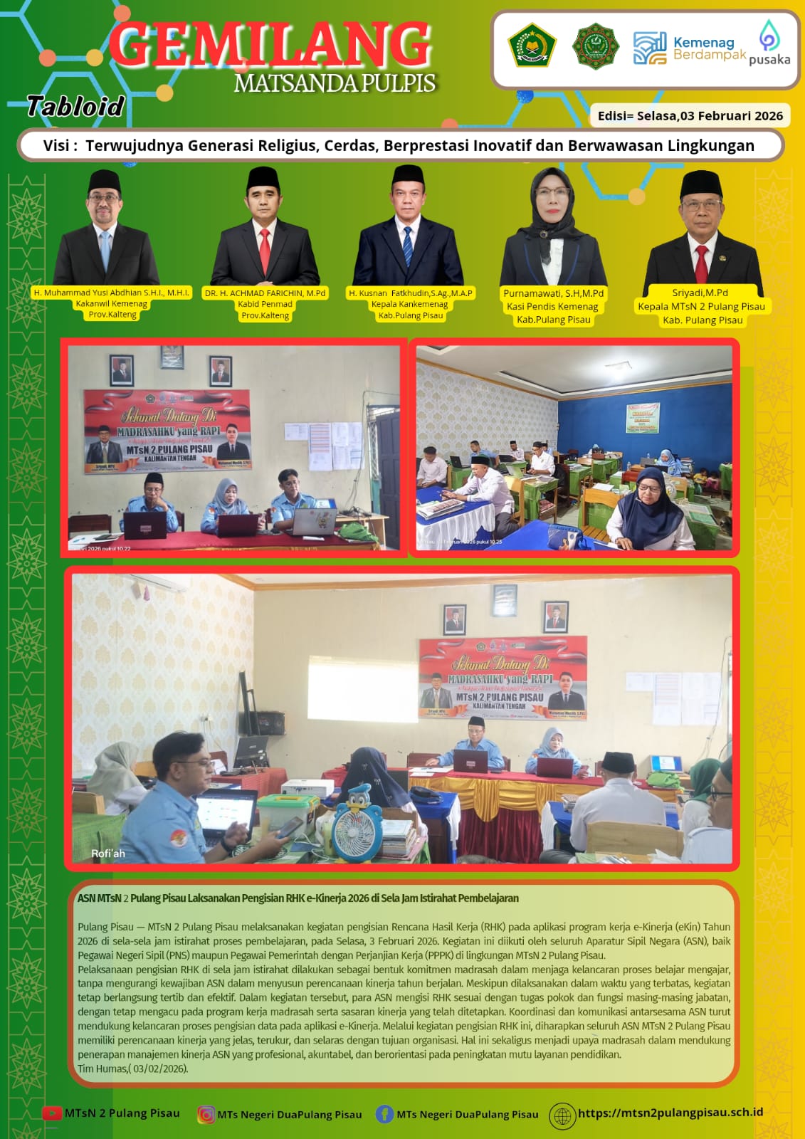 Pulang Pisau — MTsN 2 Pulang Pisau melaksanakan kegiatan pengisian Rencana Hasil Kerja (RHK) pada aplikasi program kerja e-Kinerja (eKin) Tahun 2026 di sela-sela jam istirahat proses pembelajaran, pada Selasa, 3 Februari 2026. Kegiatan ini diikuti oleh seluruh Aparatur Sipil Negara (ASN), baik Pegawai Negeri Sipil (PNS) maupun Pegawai Pemerintah dengan Perjanjian Kerja (PPPK) di lingkungan MTsN 2 Pulang Pisau. Pelaksanaan pengisian RHK di sela jam istirahat dilakukan sebagai bentuk komitmen madrasah dalam menjaga kelancaran proses belajar mengajar, tanpa mengurangi kewajiban ASN dalam menyusun perencanaan kinerja tahun berjalan. Meskipun dilaksanakan dalam waktu yang terbatas, kegiatan tetap berlangsung tertib dan efektif. Dalam kegiatan tersebut, para ASN mengisi RHK sesuai dengan tugas pokok dan fungsi masing-masing jabatan, dengan tetap mengacu pada program kerja madrasah serta sasaran kinerja yang telah ditetapkan. Koordinasi dan komunikasi antarsesama ASN turut mendukung kelancaran proses pengisian data pada aplikasi e-Kinerja. Melalui kegiatan pengisian RHK ini, diharapkan seluruh ASN MTsN 2 Pulang Pisau memiliki perencanaan kinerja yang jelas, terukur, dan selaras dengan tujuan organisasi. Hal ini sekaligus menjadi upaya madrasah dalam mendukung penerapan manajemen kinerja ASN yang profesional, akuntabel, dan berorientasi pada peningkatan mutu layanan pendidikan. Tim Humas,( 03/02/2026).