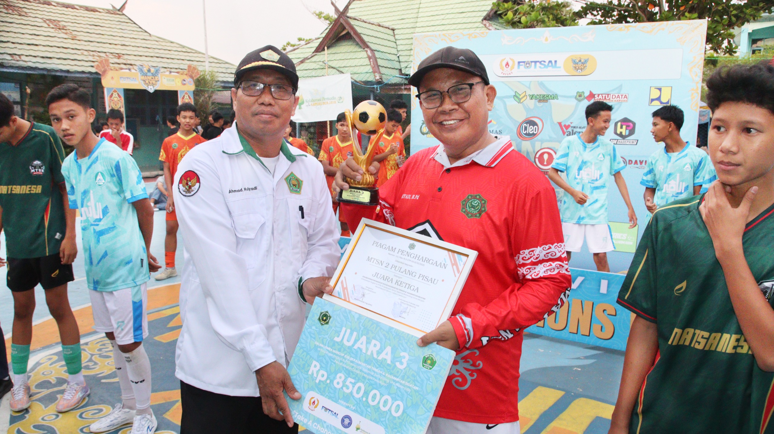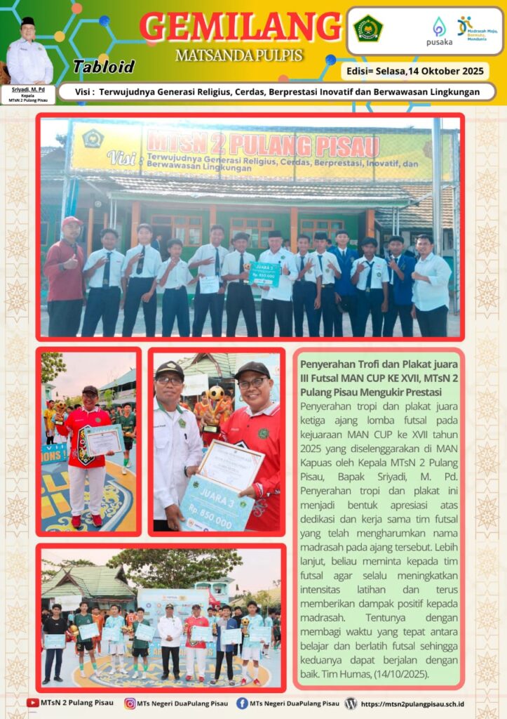 Penyerahan tropi dan plakat juara ketiga ajang lomba futsal pada kejuaraan MAN CUP ke XVII tahun 2025 yang diselenggarakan di MAN Kapuas oleh Kepala MTsN 2 Pulang Pisau, Bapak Sriyadi, M. Pd. Penyerahan tropi dan plakat ini menjadi bentuk apresiasi atas dedikasi dan kerja sama tim futsal yang telah mengharumkan nama madrasah pada ajang tersebut. Lebih lanjut, beliau meminta kepada tim futsal agar selalu meningkatkan intensitas latihan dan terus memberikan dampak positif kepada madrasah. Tentunya dengan membagi waktu yang tepat antara belajar dan berlatih futsal sehingga keduanya dapat berjalan dengan baik. Tim Humas, (14/10/2025).