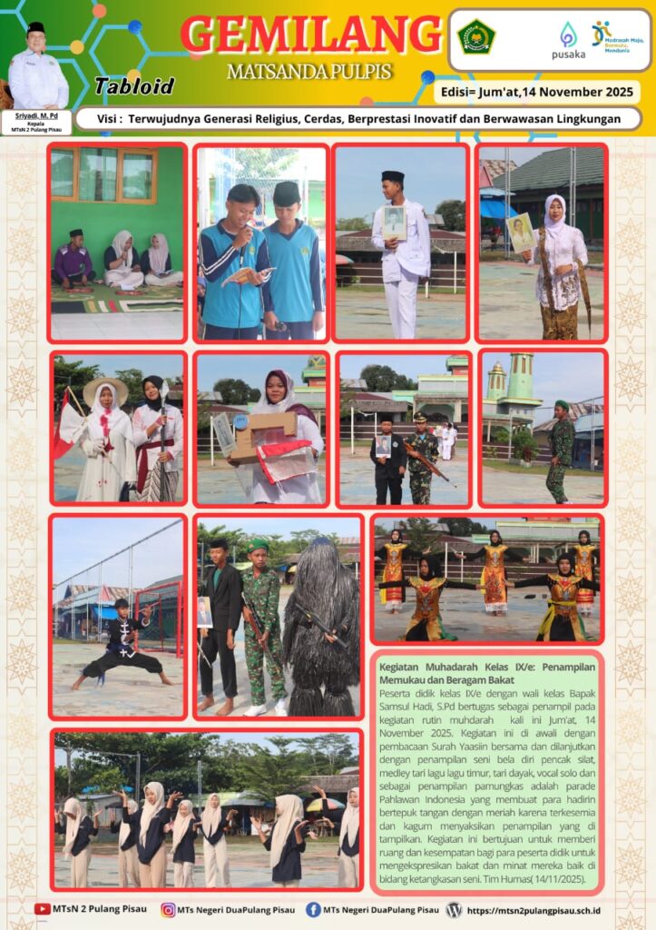Peserta didik kelas IX/e dengan wali kelas Bapak Samsul Hadi, S.Pd bertugas sebagai penampil pada kegiatan rutin muhdarah kali ini Jum’at, 14 November 2025. Kegiatan ini di awali dengan pembacaan Surah Yaasiin bersama dan dilanjutkan dengan penampilan seni bela diri pencak silat, medley tari lagu lagu timur, tari dayak, vocal solo dan sebagai penampilan pamungkas adalah parade Pahlawan Indonesia yang membuat para hadirin bertepuk tangan dengan meriah karena terkesemia dan kagum menyaksikan penampilan yang di tampilkan. Kegiatan ini bertujuan untuk memberi ruang dan kesempatan bagi para peserta didik untuk mengekspresikan bakat dan minat mereka baik di bidang ketangkasan seni. Tim Humas( 14/11/2025).