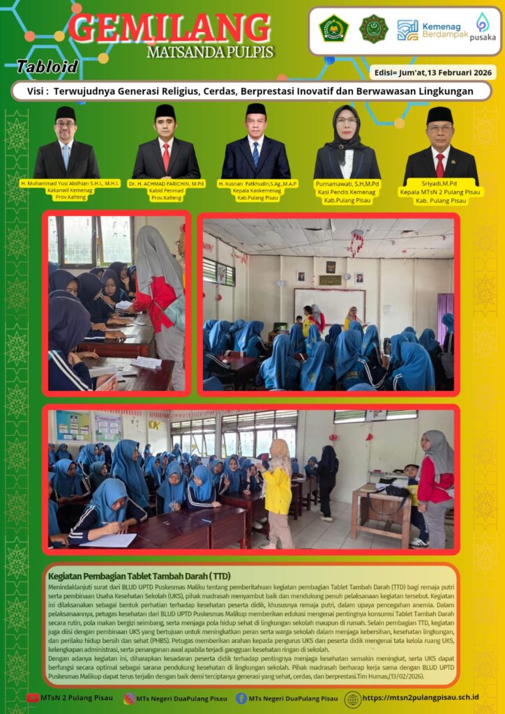 Menindaklanjuti surat dari BLUD UPTD Puskesmas Maliku tentang pemberitahuan kegiatan pembagian Tablet Tambah Darah (TTD) bagi remaja putri serta pembinaan Usaha Kesehatan Sekolah (UKS), pihak madrasah menyambut baik dan mendukung penuh pelaksanaan kegiatan tersebut. Kegiatan ini dilaksanakan sebagai bentuk perhatian terhadap kesehatan peserta didik, khususnya remaja putri, dalam upaya pencegahan anemia. Dalam pelaksanaannya, petugas kesehatan dari BLUD UPTD Puskesmas Maliku memberikan edukasi mengenai pentingnya konsumsi Tablet Tambah Darah secara rutin, pola makan bergizi seimbang, serta menjaga pola hidup sehat di lingkungan sekolah maupun di rumah. Selain pembagian TTD, kegiatan juga diisi dengan pembinaan UKS yang bertujuan untuk meningkatkan peran serta warga sekolah dalam menjaga kebersihan, kesehatan lingkungan, dan perilaku hidup bersih dan sehat (PHBS). Petugas memberikan arahan kepada pengurus UKS dan peserta didik mengenai tata kelola ruang UKS, kelengkapan administrasi, serta penanganan awal apabila terjadi gangguan kesehatan ringan di sekolah.