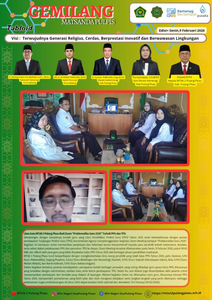 Sehubungan dengan banyaknya jumlah guru yang lulus Pendidikan Profesi Guru (PPG) Tahun 2025 serta keterkaitannya dengan proses pembayaran Tunjangan Profesi Guru (TPG), Kementerian Agama menyelenggarakan kegiatan Zoom Meeting bertajuk “Problematika Guru 2026”. Kegiatan ini bertujuan untuk memberikan penjelasan dan informasi secara komprehensif kepada para pendidik terkait mekanisme, kendala, serta solusi dalam pelaksanaan PPG dan pencairan TPG ke depan. Zoom Meeting tersebut dilaksanakan pada Senin, 9 Februari 2026, pukul 09.00 WIB, dan diikuti oleh para guru yang telah dinyatakan lulus PPG Tahun 2025 dari berbagai satuan pendidikan madrasah.