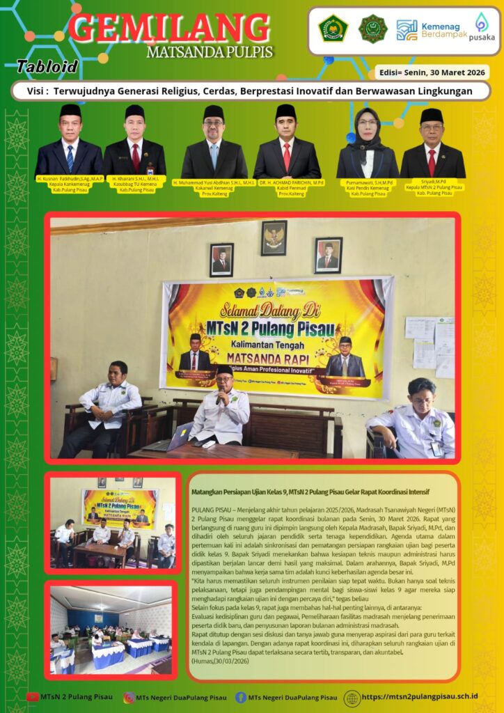 PULANG PISAU – Menjelang akhir tahun pelajaran 2025/2026, Madrasah Tsanawiyah Negeri (MTsN) 2 Pulang Pisau menggelar rapat koordinasi bulanan pada Senin, 30 Maret 2026. Rapat yang berlangsung di ruang guru ini dipimpin langsung oleh Kepala Madrasah, Bapak Sriyadi, M.Pd, dan dihadiri oleh seluruh jajaran pendidik serta tenaga kependidikan. Agenda utama dalam pertemuan kali ini adalah sinkronisasi dan pematangan persiapan rangkaian ujian bagi peserta didik kelas 9. Bapak Sriyadi menekankan bahwa kesiapan teknis maupun administrasi harus dipastikan berjalan lancar demi hasil yang maksimal. Dalam arahannya, Bapak Sriyadi, M.Pd menyampaikan bahwa kerja sama tim adalah kunci keberhasilan agenda besar ini.