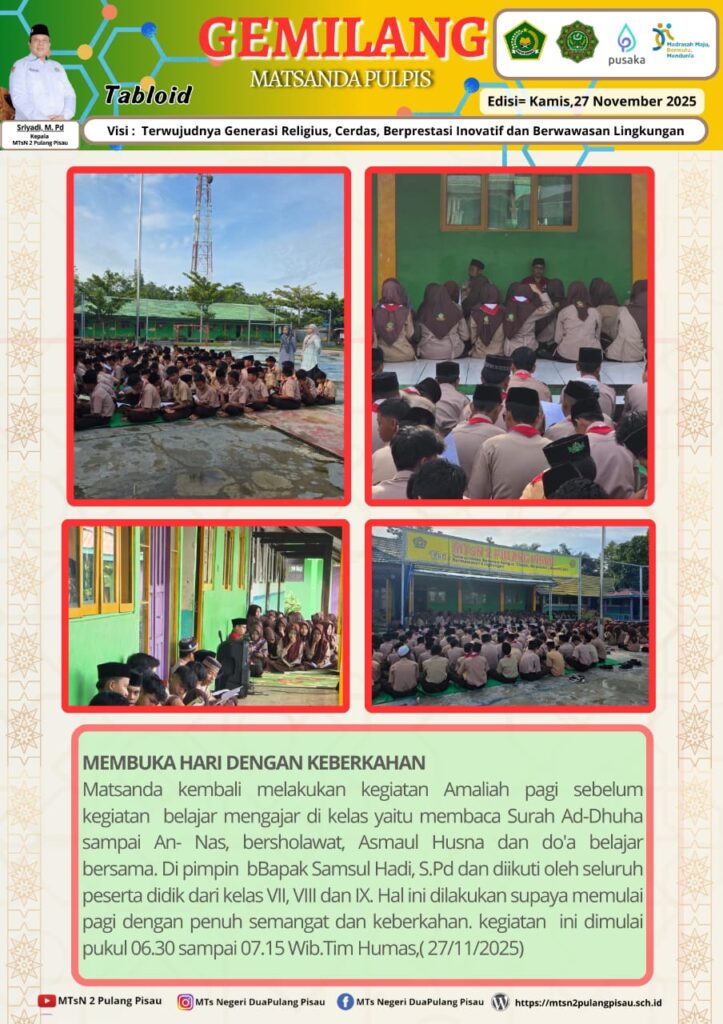 Matsanda kembali melakukan kegiatan Amaliah pagi sebelum kegiatan belajar mengajar di kelas yaitu membaca Surah Ad-Dhuha sampai An- Nas, bersholawat, Asmaul Husna dan do’a belajar bersama. Di pimpin bBapak Samsul Hadi, S.Pd dan diikuti oleh seluruh peserta didik dari kelas VII, VIII dan IX. Hal ini dilakukan supaya memulai pagi dengan penuh semangat dan keberkahan. kegiatan ini dimulai pukul 06.30 sampai 07.15 Wib.Tim Humas,( 27/11/2025)