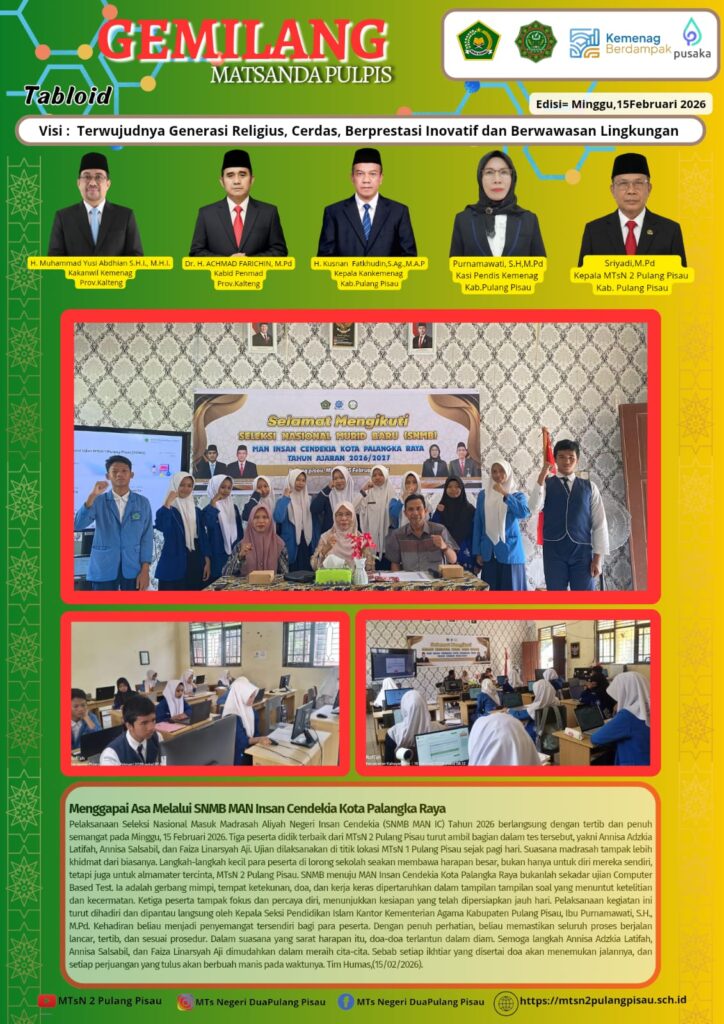 Pelaksanaan Seleksi Nasional Masuk Madrasah Aliyah Negeri Insan Cendekia (SNMB MAN IC) Tahun 2026 berlangsung dengan tertib dan penuh semangat pada Minggu, 15 Februari 2026. Tiga peserta didik terbaik dari MTsN 2 Pulang Pisau turut ambil bagian dalam tes tersebut, yakni Annisa Adzkia Latifah, Annisa Salsabil, dan Faiza Linarsyah Aji. Ujian dilaksanakan di titik lokasi MTsN 1 Pulang Pisau sejak pagi hari. Suasana madrasah tampak lebih khidmat dari biasanya. Langkah-langkah kecil para peserta di lorong sekolah seakan membawa harapan besar, bukan hanya untuk diri mereka sendiri, tetapi juga untuk almamater tercinta, MTsN 2 Pulang Pisau. SNMB menuju MAN Insan Cendekia Kota Palangka Raya bukanlah sekadar ujian Computer Based Test. Ia adalah gerbang mimpi, tempat ketekunan, doa, dan kerja keras dipertaruhkan dalam tampilan tampilan soal yang menuntut ketelitian dan kecermatan. Ketiga peserta tampak percaya diri, menunjukkan kesiapan yang telah dipersiapkan jauh hari. Pelaksanaan kegiatan ini turut dihadiri dan dipantau langsung oleh Kepala Seksi Pendidikan Islam Kantor Kementerian Agama Kabupaten Pulang Pisau, Ibu Purnamawati, S.H., M.Pd. Kehadiran beliau menjadi penyemangat tersendiri bagi para peserta. Dengan penuh perhatian, beliau memastikan seluruh proses berjalan lancar, tertib, dan sesuai prosedur. Dalam suasana yang sarat harapan itu, doa-doa terlontar dalam diam. Semoga langkah Annisa Adzkia Latifah, Annisa Salsabil, dan Faiza Linarsyah Aji dimudahkan dalam meraih cita-cita. Sebab setiap ikhtiar yang disertai doa akan menemukan jalannya, dan setiap perjuangan yang tulus akan berbuah manis pada waktunya.