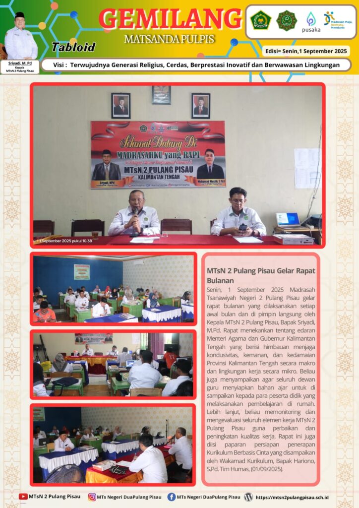 Senin, 1 September 2025 Madrasah Tsanawiyah Negeri 2 Pulang Pisau gelar rapat bulanan yang dilaksanakan setiap awal bulan dan di pimpin langsung oleh Kepala MTsN 2 Pulang Pisau, Bapak Sriyadi, M.Pd. Rapat menekankan tentang edaran Menteri Agama dan Gubernur Kalimantan Tengah yang berisi himbauan menjaga kondusivitas, kemanan, dan kedamaian Provinsi Kalimantan Tengah secara makro dan lingkungan kerja secara mikro. Beliau juga menyampaikan agar seluruh dewan guru menyiapkan bahan ajar untuk di sampaikan kepada para peserta didik yang melaksanakan pembelajaran di rumah. Lebih lanjut, beliau memonitoring dan mengevaluasi seluruh elemen kerja MTsN 2 Pulang Pisau guna perbaikan dan peningkatan kualitas kerja. Rapat ini juga diisi paparan persiapan penerapan Kurikulum Berbasis Cinta yang disampaikan oleh Wakamad Kurikulum, Bapak Hariono, S.Pd. Tim Humas, (01/09/2025).