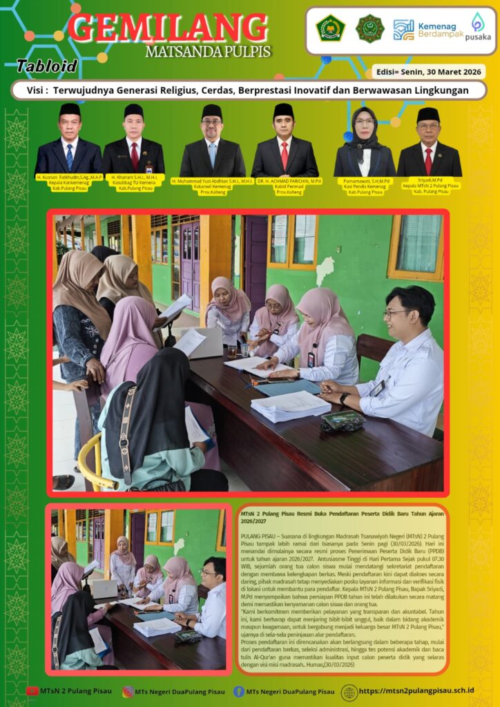 PULANG PISAU – Suasana di lingkungan Madrasah Tsanawiyah Negeri (MTsN) 2 Pulang Pisau tampak lebih ramai dari biasanya pada Senin pagi (30/03/2026). Hari ini menandai dimulainya secara resmi proses Penerimaan Peserta Didik Baru (PPDB) untuk tahun ajaran 2026/2027. Antusiasme Tinggi di Hari Pertama Sejak pukul 07.30 WIB, sejumlah orang tua calon siswa mulai mendatangi sekretariat pendaftaran dengan membawa kelengkapan berkas. Meski pendaftaran kini dapat diakses secara daring, pihak madrasah tetap menyediakan posko layanan informasi dan verifikasi fisik di lokasi untuk membantu para pendaftar. Kepala MTsN 2 Pulang Pisau, Bapak Sriyadi, M.Pd mengungkapkan bahwa persiapan PPDB tahun ini telah dilakukan secara matang demi memastikan kenyamanan calon siswa dan orang tua.