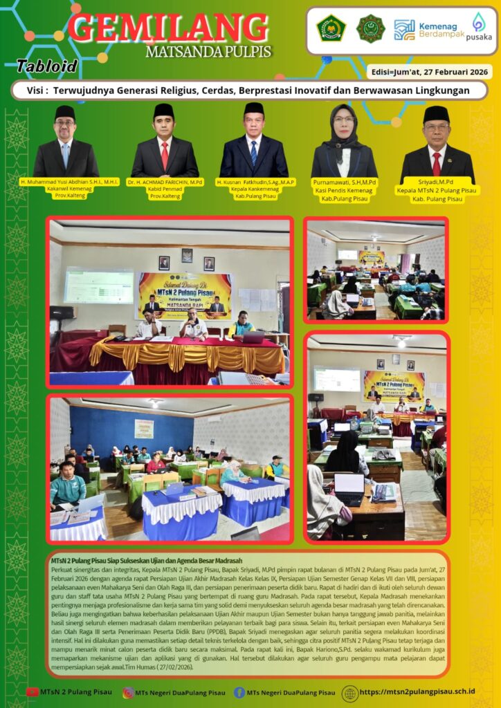 Perkuat sinergitas dan integritas, Kepala MTsN 2 Pulang Pisau, Bapak Sriyadi, M.Pd pimpin rapat bulanan di MTsN 2 Pulang Pisau pada Jum’at, 27 Februari 2026 dengan agenda rapat Persiapan Ujian Akhir Madrasah Kelas Kelas IX, Persiapan Ujian Semester Genap Kelas VII dan VIII, persiapan pelaksanaan even Mahakarya Seni dan Olah Raga III, dan persiapan penerimaan peserta didik baru. Rapat di hadiri dan di ikuti oleh seluruh dewan guru dan staff tata usaha MTsN 2 Pulang Pisau yang bertempat di ruang guru Madrasah. Pada rapat tersebut, Kepala Madrasah menekankan pentingnya menjaga profesionalisme dan kerja sama tim yang solid demi menyukseskan seluruh agenda besar madrasah yang telah direncanakan. Beliau juga mengingatkan bahwa keberhasilan pelaksanaan Ujian Akhir maupun Ujian Semester bukan hanya tanggung jawab panitia, melainkan hasil sinergi seluruh elemen madrasah dalam memberikan pelayanan terbaik bagi para siswa. Selain itu, terkait persiapan even Mahakarya Seni dan Olah Raga III serta Penerimaan Peserta Didik Baru (PPDB), Bapak Sriyadi menegaskan agar seluruh panitia segera melakukan koordinasi intensif. Hal ini dilakukan guna memastikan setiap detail teknis terkelola dengan baik, sehingga citra positif MTsN 2 Pulang Pisau tetap terjaga dan mampu menarik minat calon peserta didik baru secara maksimal. Pada rapat kali ini, Bapak Hariono,S.Pd. selaku wakamad kurikulum juga memaparkan mekanisme ujian dan aplikasi yang di gunakan. Hal tersebut dilakukan agar seluruh guru pengampu mata pelajaran dapat mempersiapkan sejak awal.