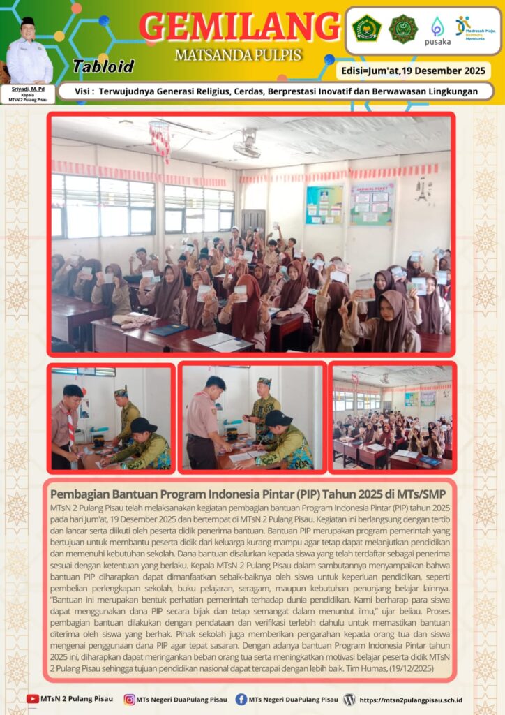 MTsN 2 Pulang Pisau telah melaksanakan kegiatan pembagian bantuan Program Indonesia Pintar (PIP) tahun 2025 pada hari Jum’at, 19 Desember 2025 dan bertempat di MTsN 2 Pulang Pisau. Kegiatan ini berlangsung dengan tertib dan lancar serta diikuti oleh peserta didik penerima bantuan. Bantuan PIP merupakan program pemerintah yang bertujuan untuk membantu peserta didik dari keluarga kurang mampu agar tetap dapat melanjutkan pendidikan dan memenuhi kebutuhan sekolah. Dana bantuan disalurkan kepada siswa yang telah terdaftar sebagai penerima sesuai dengan ketentuan yang berlaku. Kepala MTsN 2 Pulang Pisau dalam sambutannya menyampaikan bahwa bantuan PIP diharapkan dapat dimanfaatkan sebaik-baiknya oleh siswa untuk keperluan pendidikan, seperti pembelian perlengkapan sekolah, buku pelajaran, seragam, maupun kebutuhan penunjang belajar lainnya. “Bantuan ini merupakan bentuk perhatian pemerintah terhadap dunia pendidikan. Kami berharap para siswa dapat menggunakan dana PIP secara bijak dan tetap semangat dalam menuntut ilmu,” ujar beliau. Proses pembagian bantuan dilakukan dengan pendataan dan verifikasi terlebih dahulu untuk memastikan bantuan diterima oleh siswa yang berhak. Pihak sekolah juga memberikan pengarahan kepada orang tua dan siswa mengenai penggunaan dana PIP agar tepat sasaran. Dengan adanya bantuan Program Indonesia Pintar tahun 2025 ini, diharapkan dapat meringankan beban orang tua serta meningkatkan motivasi belajar peserta didik MTsN 2 Pulang Pisau sehingga tujuan pendidikan nasional dapat tercapai dengan lebih baik. Tim Humas (19/12/2025)