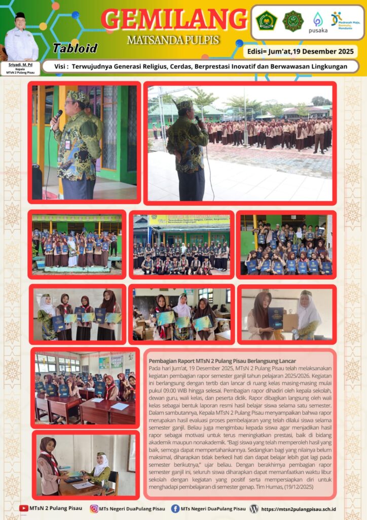 Pada hari Jum’at, 19 Desember 2025, MTsN 2 Pulang Pisau telah melaksanakan kegiatan pembagian rapor semester ganjil tahun pelajaran 2025/2026. Kegiatan ini berlangsung dengan tertib dan lancar di ruang kelas masing-masing mulai pukul 09.00 WIB hingga selesai. Pembagian rapor dihadiri oleh kepala sekolah, dewan guru, wali kelas, dan peserta didik. Rapor dibagikan langsung oleh wali kelas sebagai bentuk laporan resmi hasil belajar siswa selama satu semester. Dalam sambutannya, Kepala MTsN 2 Pulang Pisau menyampaikan bahwa rapor merupakan hasil evaluasi proses pembelajaran yang telah dilalui siswa selama semester ganjil. Beliau juga mengimbau kepada siswa agar menjadikan hasil rapor sebagai motivasi untuk terus meningkatkan prestasi, baik di bidang akademik maupun nonakademik. “Bagi siswa yang telah memperoleh hasil yang baik, semoga dapat mempertahankannya. Sedangkan bagi yang nilainya belum maksimal, diharapkan tidak berkecil hati dan dapat belajar lebih giat lagi pada semester berikutnya,” ujar beliau. Dengan berakhirnya pembagian rapor semester ganjil ini, seluruh siswa diharapkan dapat memanfaatkan waktu libur sekolah dengan kegiatan yang positif serta mempersiapkan diri untuk menghadapi pembelajaran di semester genap. Tim Humas, (19/12/2025)