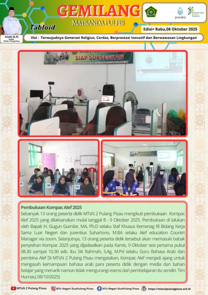 Sebanyak 13 orang peserta didik MTsN 2 Pulang Pisau mengikuti pembukaan Kompac Alef 2025 yang dilaksanakan mulai tanggal 8 – 9 Oktober 2025. Pembukaan di lalukan oleh Bapak H. Gugun Gumilar, MA, Ph.D selaku Staf Khusus Kemenag RI Bidang Kerja Sama Luar Negeri dan juventius Suhartono, M.BA selaku Alef education Countrt Manager via zoom. Selanjutnya, 13 orang peserta didik tersebut akan memasuki babak penyisihan Kompac 2025 yang dijadwalkan pada Kamis, 9 Oktober sesi pertama pukul 08.30 sampai 10.30 wib. Ibu Siti Rahmah, S.Ag, M.Pd selaku Guru Bahasa Arab dan pembina Alef Di MTsN 2 Pulang Pisau mengatakan, Kompac Alef menjadi ajang untuk mengasah kemampuan bahasa arab para peserta didik dengan media dan bahan belajar yang menarik namun tidak mengurangi esensi dari pembelajaran itu sendiri. Tim Humas,( 08/10/2025)
