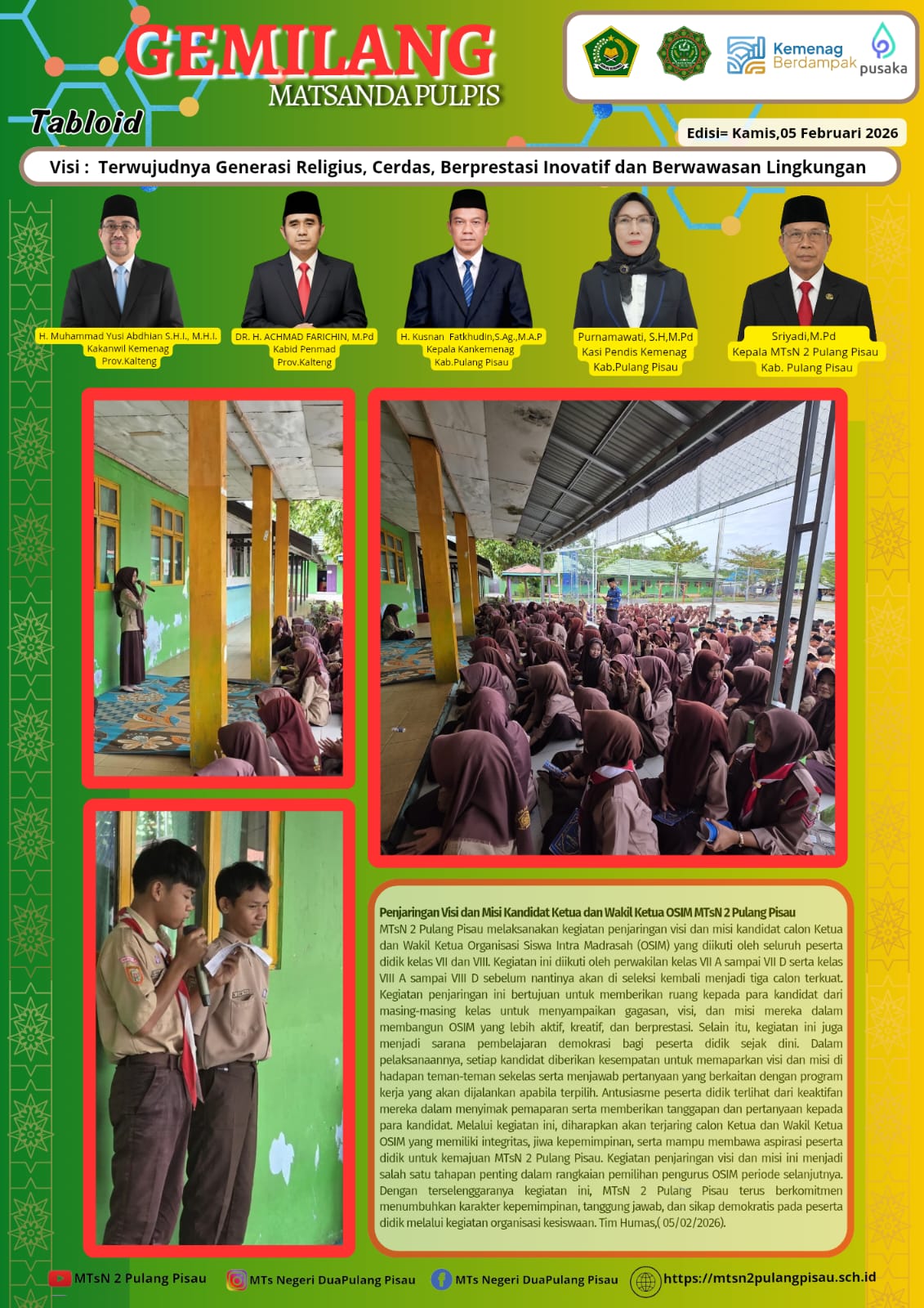 MTsN 2 Pulang Pisau melaksanakan kegiatan penjaringan visi dan misi kandidat calon Ketua dan Wakil Ketua Organisasi Siswa Intra Madrasah (OSIM) yang diikuti oleh seluruh peserta didik kelas VII dan VIII. Kegiatan ini diikuti oleh perwakilan kelas VII A sampai VII D serta kelas VIII A sampai VIII D sebelum nantinya akan di seleksi kembali menjadi tiga calon terkuat. Kegiatan penjaringan ini bertujuan untuk memberikan ruang kepada para kandidat dari masing-masing kelas untuk menyampaikan gagasan, visi, dan misi mereka dalam membangun OSIM yang lebih aktif, kreatif, dan berprestasi. Selain itu, kegiatan ini juga menjadi sarana pembelajaran demokrasi bagi peserta didik sejak dini. Dalam pelaksanaannya, setiap kandidat diberikan kesempatan untuk memaparkan visi dan misi di hadapan teman-teman sekelas serta menjawab pertanyaan yang berkaitan dengan program kerja yang akan dijalankan apabila terpilih. Antusiasme peserta didik terlihat dari keaktifan mereka dalam menyimak pemaparan serta memberikan tanggapan dan pertanyaan kepada para kandidat. Melalui kegiatan ini, diharapkan akan terjaring calon Ketua dan Wakil Ketua OSIM yang memiliki integritas, jiwa kepemimpinan, serta mampu membawa aspirasi peserta didik untuk kemajuan MTsN 2 Pulang Pisau. Kegiatan penjaringan visi dan misi ini menjadi salah satu tahapan penting dalam rangkaian pemilihan pengurus OSIM periode selanjutnya. Dengan terselenggaranya kegiatan ini, MTsN 2 Pulang Pisau terus berkomitmen menumbuhkan karakter kepemimpinan, tanggung jawab, dan sikap demokratis pada peserta didik melalui kegiatan organisasi kesiswaan. Tim Humas,( 05/02/2026).