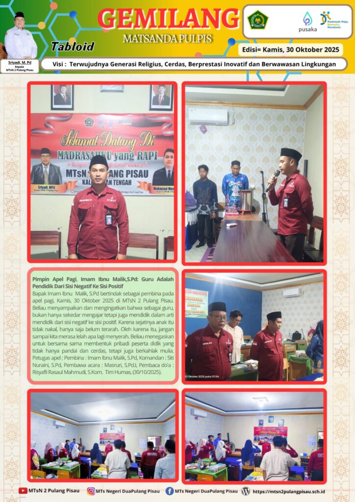 Bapak Imam Ibnu Malik, S.Pd bertindak sebagai pembina pada apel pagi, Kamis, 30 Oktober 2025 di MTsN 2 Pulang Pisau. Beliau menyampaikan dan mengingatkan bahwa sebagai guru, bukan hanya sekedar mengajar tetapi juga mendidik dalam arti mendidik dari sisi negatif ke sisi positif. Karena sejatinya anak itu tidak nakal, hanya saja belum terarah. Oleh karena itu, jangan sampai kita merasa lelah apa lagi menyerah. Beliau menegaskan untuk bersama sama membentuk pribadi peserta didik yang tidak hanya pandai dan cerdas, tetapi juga berkahlak mulia. Petugas apel ; Pembina : Imam Ibnu Malik, S.Pd, Komandan : Siti Nuraini, S.Pd, Pembawa acara : Masruri, S.Pd.I, Pembaca do’a : Risyafli Rasaul Mahmudi, S.Kom. Tim Humas, (30/10/2025).