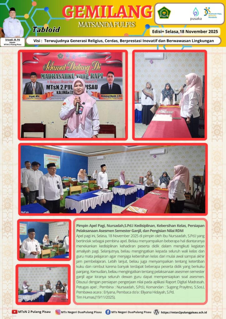 Apel pagi ini, Selasa, 18 November 2025 di pimpin oleh Ibu Nursaadah, S.Pd.I yang bertindak sebagai pembina apel. Beliau menyampaikan beberapa hal diantaranya menekankan kedisiplinan kehadiran peserta didik dalam mengikuti kegiatan amaliyah pagi. Selanjutnya, beliau mengingatkan kepada seluruh wali kelas dan guru mata pelajaran agar menjaga kebersihan kelas dari mulai awal sampai akhir jam pembelajaran. Lebih lanjut, beliau juga menyampaikan tentang ketertiban kuku dan rambut karena banyak terdapat beberapa peserta didik yang berkuku panjang. Kemudian, beliau mengingatkan tentang pelaksanaan asesmen semester ganjil agar kiranya seluruh dewan guru dapat mempersiapkan soal asesmen. Disusul dengan persiapan pengerjaan nilai pada aplikasi Raport Digital Madrasah. Petugas apel ; Pembina : Nursaadah, S.Pd.I, Komandan : Sugeng Prayitno, S.Sos.I, Pembawa acara : Erlyana, Pembaca do’a : Eliyana Hidayah, S.Pd. Tim Humas,(19/11/2025).