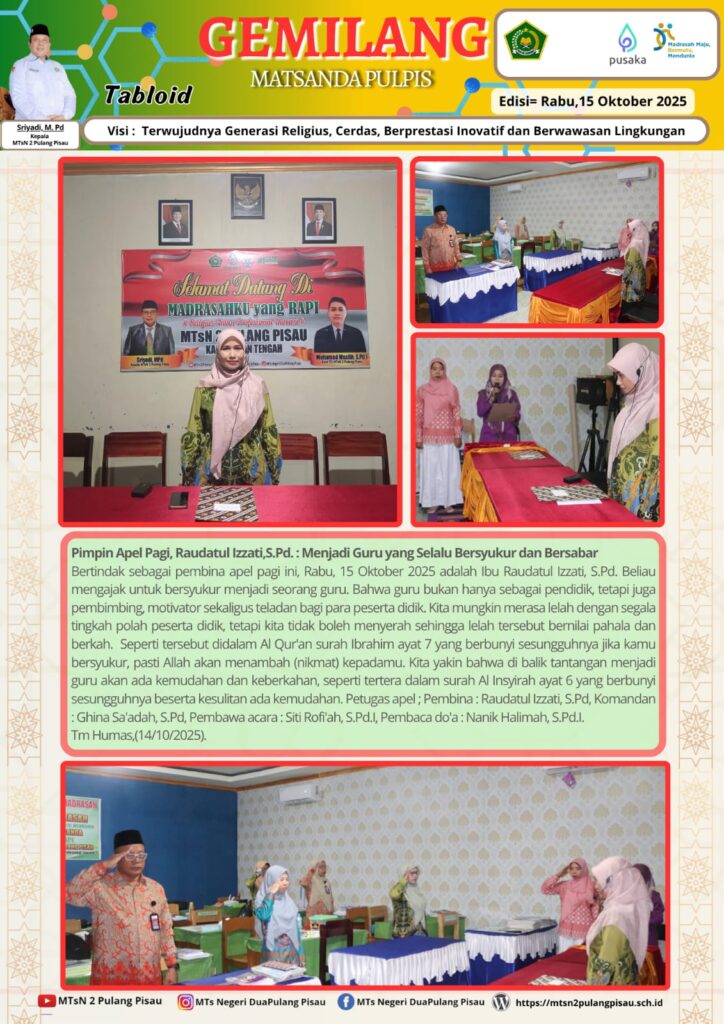 Bertindak sebagai pembina apel pagi ini, Rabu, 15 Oktober 2025 adalah Ibu Raudatul Izzati, S.Pd. Beliau mengajak untuk bersyukur menjadi seorang guru. Bahwa guru bukan hanya sebagai pendidik, tetapi juga pembimbing, motivator sekaligus teladan bagi para peserta didik. Kita mungkin merasa lelah dengan segala tingkah polah peserta didik, tetapi kita tidak boleh menyerah sehingga lelah tersebut bernilai pahala dan berkah. Seperti tersebut didalam Al Qur’an surah Ibrahim ayat 7 yang berbunyi sesungguhnya jika kamu bersyukur, pasti Allah akan menambah (nikmat) kepadamu. Kita yakin bahwa di balik tantangan menjadi guru akan ada kemudahan dan keberkahan, seperti tertera dalam surah Al Insyirah ayat 6 yang berbunyi sesungguhnya beserta kesulitan ada kemudahan. Petugas apel ; Pembina : Raudatul Izzati, S.Pd, Komandan : Ghina Sa’adah, S.Pd, Pembawa acara : Siti Rofi’ah, S.Pd.I, Pembaca do’a : Nanik Halimah, S.Pd.I. Tim Humas,(14/10/2025).