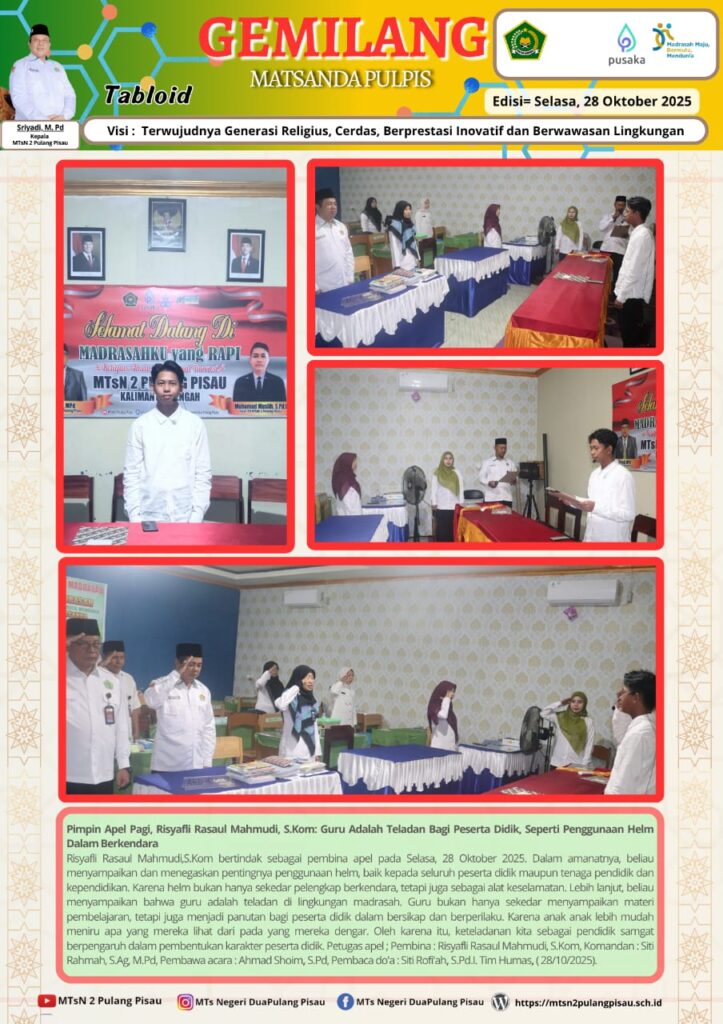 Risyafli Rasaul Mahmudi,S.Kom bertindak sebagai pembina apel pada Selasa, 28 Oktober 2025. Dalam amanatnya, beliau menyampaikan dan menegaskan pentingnya penggunaan helm, baik kepada seluruh peserta didik maupun tenaga pendidik dan kependidikan. Karena helm bukan hanya sekedar pelengkap berkendara, tetapi juga sebagai alat keselamatan. Lebih lanjut, beliau menyampaikan bahwa guru adalah teladan di lingkungan madrasah. Guru bukan hanya sekedar menyampaikan materi pembelajaran, tetapi juga menjadi panutan bagi peserta didik dalam bersikap dan berperilaku. Karena anak anak lebih mudah meniru apa yang mereka lihat dari pada yang mereka dengar. Oleh karena itu, keteladanan kita sebagai pendidik samgat berpengaruh dalam pembentukan karakter peserta didik. Petugas apel ; Pembina : Risyafli Rasaul Mahmudi, S.Kom, Komandan : Siti Rahmah, S.Ag, M.Pd, Pembawa acara : Ahmad Shoim, S.Pd, Pembaca do’a : Siti Rofi’ah, S.Pd.I. Tim Humas, ( 28/10/2025).