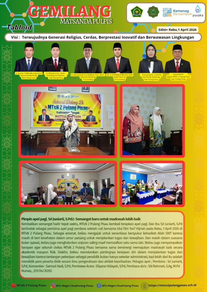 Kembalikan semangat hadir tepat waktu, MTsN 2 Pulang Pisau kembali terapkan apel pagi. Dan Ibu Sri Juniarti, S.Pd bertindak sebagai pembina apel pagi perdana setelah cuti bersama Idul Fitri 1447 Hijriah pada Rabu, 1 April 2026 di MTsN 2 Pulang Pisau. Sebagai amanat, beliau mengajak untuk senantiasa bersyukur kehadirat Allah SWT karena masih di beri kesehatan dalam umur panjang untuk menjalankan tugas dan kewajiban. Dan masih dalam suasana bulan syawal, beliau juga menghaturkan anjuran saling maaf memaafkan satu sama lain. Beliau juga menyampaikan harapan agar seluruh civitas MTsN 2 Pulang Pisau bersama sama bersinergi memajukan madrasah baik secara akademik maupun fisik. Diakhir, beliau menekankan pentingnya kesiapan diri dalam menjalankan tugas dan kewajiban karena tantangan pekerjaan sebagai pendidik bukan hanya sekedar administrasi, tapi lebih dari itu adalah mendidik para peserta didik secara ilmu pengetahuan dan akhlak kepribadian. Petugas apel ; Pembina : Sri Juniarti, S.Pd, Komandan : Samsul Hadi, S.Pd, Pembawa Acara : Eliyana Hidayah, S.Pd, Pembaca doa : Siti Rahmah, S.Ag, M.Pd Humas, (01/04/2026)