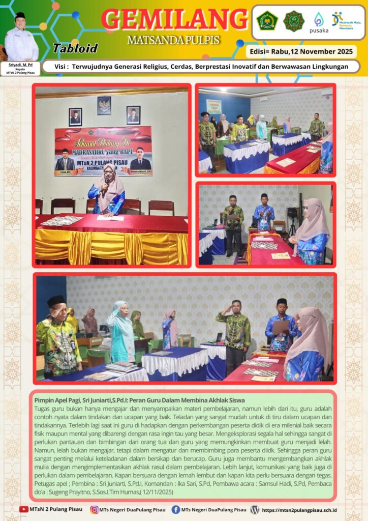 Tugas guru bukan hanya mengajar dan menyampaikan materi pembelajaran, namun lebih dari itu, guru adalah contoh nyata dalam tindakan dan ucapan yang baik. Teladan yang sangat mudah untuk di tiru dalam ucapan dan tindakannya. Terlebih lagi saat ini guru di hadapkan dengan perkembangan peserta didik di era milenial baik secara fisik maupun mental yang dibarengi dengan rasa ingin tau yang besar. Mengeksplorasi segala hal sehingga sangat di perlukan pantauan dan bimbingan dari orang tua dan guru yang memungkinkan membuat guru menjadi lelah. Namun, lelah bukan mengajar, tetapi dalam mengatur dan membimbing para peserta diidk. Sehingga peran guru sangat penting melalui keteladanan dalam bersikap dan berucap. Guru juga membantu mengembangkan akhlak mulia dengan mengimplementasikan akhlak rasul dalam pembelajaran. Lebih lanjut, komunikasi yang baik juga di perlukan dalam pembelajaran. Kapan bersuara dengan lemah lembut dan kapan kita perlu bersuara dengan tegas. Petugas apel ; Pembina : Sri Juniarti, S.Pd.I, Komandan : Ika Sari, S.Pd, Pembawa acara : Samsul Hadi, S.Pd, Pembaca do’a : Sugeng Prayitno, S.Sos.I.Tim Humas,( 12/11/2025)