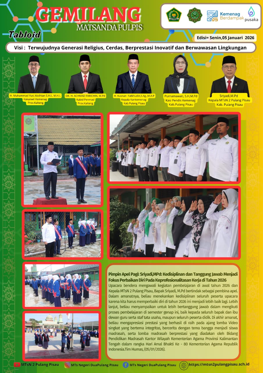 Upacara bendera mengawali kegiatan pembelajaran di awal tahun 2026 dan Kepala MTsN 2 Pulang Pisau, Bapak Sriyadi, M.Pd bertindak sebagai pembina apel. Dalam amanatnya, beliau menekankan kedisiplinan seluruh peserta upacara karena kita harus memperbaiki diri di tahun 2026 ini menjadi lebih baik lagi. Lebih lanjut, beliau menyampaikan untuk lebih bertanggung jawab dalam mengikuti proses pembelajaran di semester genap ini, baik kepada seluruh bapak dan ibu dewan guru serta staf tata usaha, maupun seluruh peserta didik. Di akhir amanat, beliau mengapresiasi prestasi yang berhasil di raih pada ajang lomba Video singkat yang bertema integritas, bercerita dengan tema bangga menjadi siswa madrasah, serta lomba madrasah berprestasi yang diadakan oleh Bidang Pendidikan Madrasah Kantor Wilayah Kementerian Agama Provinsi Kalimantan Tengah dalam rangka Hari Amal Bhakti Ke – 80 Kementerian Agama Republik Indonesia.Tim Humas, (05/01/2026).