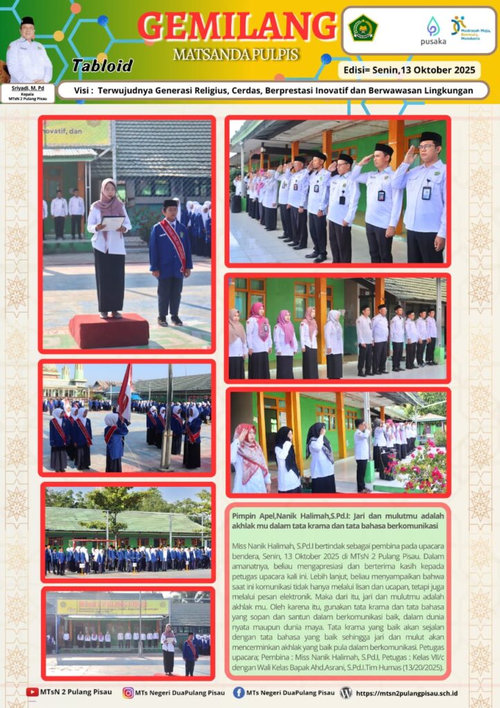 Miss Nanik Halimah, S.Pd.I bertindak sebagai pembina pada upacara bendera, Senin, 13 Oktober 2025 di MTsN 2 Pulang Pisau. Dalam amanatnya, beliau mengapresiasi dan berterima kasih kepada petugas upacara kali ini. Lebih lanjut, beliau menyampaikan bahwa saat ini komunikasi tidak hanya melalui lisan dan ucapan, tetapi juga melalui pesan elektronik. Maka dari itu, jari dan mulutmu adalah akhlak mu. Oleh karena itu, gunakan tata krama dan tata bahasa yang sopan dan santun dalam berkomunikasi baik, dalam dunia nyata maupun dunia maya. Tata krama yang baik akan sejalan dengan tata bahasa yang baik sehingga jari dan mulut akan mencerminkan akhlak yang baik pula dalam berkomunikasi. Petugas upacara; Pembina : Miss Nanik Halimah, S.Pd.I, Petugas : Kelas VII/c dengan Wali Kelas Bapak Ahd.Asrani, S.Pd.I.Tim Humas (13/20/2025).