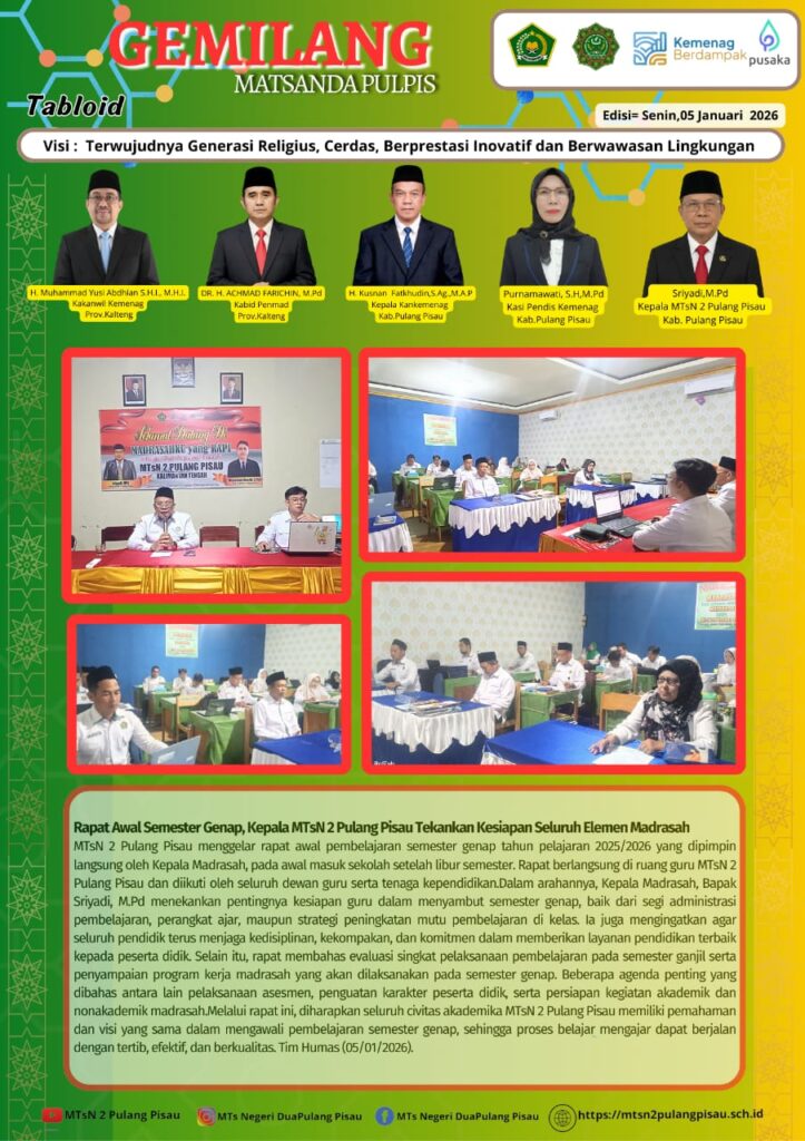MTsN 2 Pulang Pisau menggelar rapat awal pembelajaran semester genap tahun pelajaran 2025/2026 yang dipimpin langsung oleh Kepala Madrasah, pada awal masuk sekolah setelah libur semester. Rapat berlangsung di ruang guru MTsN 2 Pulang Pisau dan diikuti oleh seluruh dewan guru serta tenaga kependidikan.Dalam arahannya, Kepala Madrasah, Bapak Sriyadi, M.Pd menekankan pentingnya kesiapan guru dalam menyambut semester genap, baik dari segi administrasi pembelajaran, perangkat ajar, maupun strategi peningkatan mutu pembelajaran di kelas. Ia juga mengingatkan agar seluruh pendidik terus menjaga kedisiplinan, kekompakan, dan komitmen dalam memberikan layanan pendidikan terbaik kepada peserta didik. Selain itu, rapat membahas evaluasi singkat pelaksanaan pembelajaran pada semester ganjil serta penyampaian program kerja madrasah yang akan dilaksanakan pada semester genap. Beberapa agenda penting yang dibahas antara lain pelaksanaan asesmen, penguatan karakter peserta didik, serta persiapan kegiatan akademik dan nonakademik madrasah.Melalui rapat ini, diharapkan seluruh civitas akademika MTsN 2 Pulang Pisau memiliki pemahaman dan visi yang sama dalam mengawali pembelajaran semester genap, sehingga proses belajar mengajar dapat berjalan dengan tertib, efektif, dan berkualitas. Tim Humas (05/01/2026).