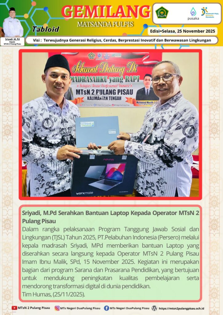 Dalam rangka pelaksanaan Program Tanggung Jawab Sosial dan Lingkungan (TJSL) Tahun 2025, PT.Pelabuhan Indonesia (Persero) melalui kepala madrasah Sriyadi, MPd memberikan bantuan Laptop yang diserahkan secara langsung kepada Operator MTsN 2 Pulang Pisau Imam Ibnu Malik, SPd, 15 November 2025. Kegiatan ini merupakan bagian dari program Sarana dan Prasarana Pendidikan, yang bertujuan untuk mendukung peningkatan kualitas pembelajaran serta mendorong transformasi digital di dunia pendidikan. Tim Humas, (25/11/2025).