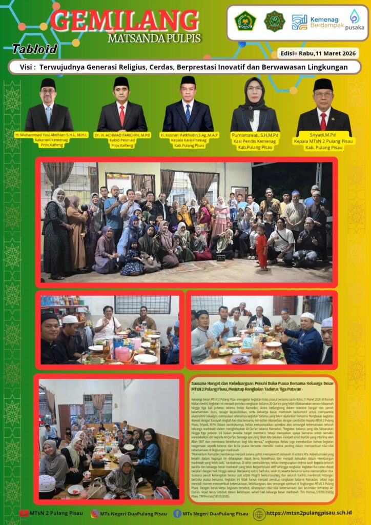 Keluarga besar MTsN 2 Pulang Pisau menggelar kegiatan buka puasa bersama pada Rabu, 11 Maret 2026 di Rumah Makan Kediri. Kegiatan ini menjadi penutup rangkaian tadarus Al-Qur’an yang telah dilaksanakan secara istiqamah hingga tiga kali putaran selama bulan Ramadan. Acara berlangsung dalam suasana hangat dan penuh kebersamaan. Guru, tenaga kependidikan, serta keluarga besar madrasah berkumpul untuk menjalin silaturahmi sekaligus mensyukuri selesainya kegiatan tadarus yang telah dijalankan bersama. Rangkaian kegiatan diawali dengan tausiyah singkat dan doa bersama, kemudian dilanjutkan dengan sambutan Kepala MTsN 2 Pulang Pisau, Sryadi, M.Pd. Dalam sambutannya, beliau menyampaikan apresiasi atas semangat kebersamaan seluruh keluarga madrasah dalam menghidupkan Al-Qur’an selama Ramadan. “Kegiatan tadarus yang kita laksanakan hingga tiga putaran ini bukan sekadar target membaca, tetapi merupakan upaya bersama untuk semakin mendekatkan diri kepada Al-Qur’an. Semoga apa yang telah kita lakukan menjadi amal ibadah yang diridhai oleh Allah SWT dan membawa keberkahan bagi kita semua,” ungkapnya. Beliau juga menekankan bahwa kegiatan keagamaan seperti tadarus dan buka puasa bersama memiliki makna penting dalam memperkuat nilai-nilai spiritual di lingkungan madrasah.