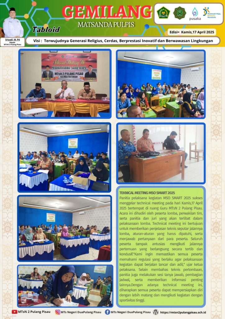 Panitia pelaksana kegiatan MSO SMART 2025 sukses menggelar technical meeting pada hari Kamis,17 April 2025 bertempat di ruang Guru MTsN 2 Pulang Pisau. Acara ini dihadiri oleh peserta lomba, perwakilan tim, serta panitia dan juri yang akan terlibat dalam pelaksanaan lomba. Technical meeting ini bertujuan untuk memberikan penjelasan teknis seputar jalannya lomba, aturan-aturan yang harus dipatuhi, serta menjawab pertanyaan dari para peserta. Seluruh peserta tampak antusias mengikuti jalannya pertemuan yang berlangsung secara tertib dan kondusif.”Kami ingin memastikan semua peserta memahami regulasi yang berlaku agar pelaksanaan kegiatan dapat berjalan lancar dan adil,” ujar ketua pelaksana. Selain membahas teknis perlombaan, panitia juga melakukan sesi tanya jawab, pembagian jadwal, serta memberikan informasi penting lainnya.Dengan adanya technical meeting ini, diharapkan semua peserta dapat mempersiapkan diri dengan lebih matang dan mengikuti kegiatan dengan sportivitas tinggi.