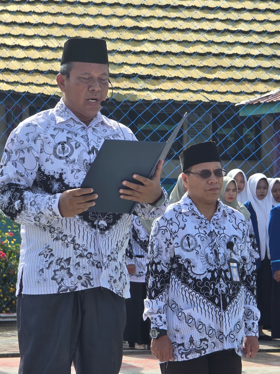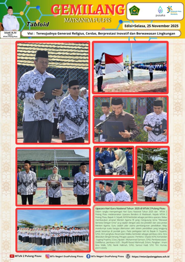Dalam rangka memperingati Hari Guru Nasional Tahun 2025 dan MTsN 2 Pulang Pisau melaksanakan Upacara Bendera di Madrasah. Kepala MTsN 2 Pulang Pisau, Bapak H. Sriyadi, M.Pd bertindak sebagai pembina upacara. Beliau membacakan amanat Menteri Agama RI yang mengusung tema “Merawat Semesta Dengan Cinta” ya g sejalan dengan asta cita presiden dan asta protas Menteri Agama. Guru adalah pilar utama pembangunan pendidikan. Maju mundurnya suatu bangsa ditentukan oleh sistem pendidikan yang tanggung jawab besarnya di pundak guru. Pada peringatan kali ini, Bapak H. Suyanto, S.Pd.I, M.H penghulu Kecamatan Maliku bertindak sebagai pembaca do’a. Do’a dibacakan dengan tenang. Petugas upacara : Pembina : Sriyadi, M.Pd, Komandan : Sugeng Prayitno, S.Sos.I, Ajudan : Muhammad Samson, S.Pd.I, Pembawa acara : Zulkiflianur, S.Pd.I pembaca UUD : Risyafli Rasaul Mahmudi, S.Kom, Pengibar : Imam Ibnu Malik, S.Pd, Nanik Halimah, S.Pd.I, Samsul Hadi, S.Pd. Tim Humas,(25/11/2025).