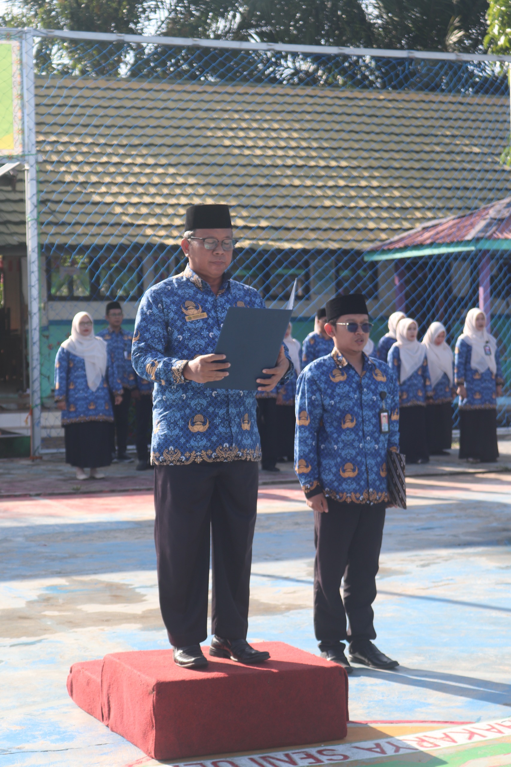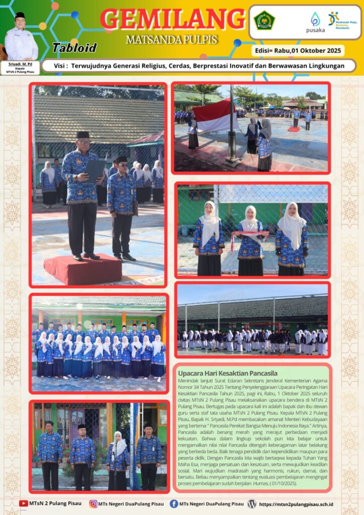 Menindak lanjuti Surat Edaran Sekretaris Jenderal Kementerian Agama Nomor 34 Tahun 2025 Tentang Penyelenggaraan Upacara Peringatan Hari Kesaktian Pancasila Tahun 2025, pagi ini, Rabu, 1 Oktober 2025 seluruh civitas MTsN 2 Pulang Pisau melaksanakan upacara bendera di MTsN 2 Pulang Pisau. Bertugas pada upacara kali ini adalah bapak dan ibu dewan guru serta staf tata usaha MTsN 2 Pulang Pisau. Kepala MTsN 2 Pulang Pisau, Bapak H. Sriyadi, M.Pd membacakan amanat Menteri Kebudayaan yang bertema ” Pancasila Perekat Bangsa Menuju Indonesia Raya.” Artinya, Pancasila adalah benang merah yang merajut perbedaan menjadi kekuatan. Bahwa dalam lingkup sekolah pun kita belajar untuk mengamalkan nilai nilai Pancasila ditengah keberagaman latar belakang yang berbeda beda. Baik tenaga pendidik dan kependidikan maupun para peserta didik. Dengan Pancasila kita wajib bertaqwa kepada Tuhan Yang Maha Esa, menjaga persatuan dan kesatuan, serta mewujudkan keadilan sosial. Mari wujudkan madrasah yang harmonis, rukun, damai, dan bersatu. Beliau menyampaikan tentang evaluasi pembelajaran mengingat proses pembelajaran sudah berjalan .Humas, ( 01/10/2025).